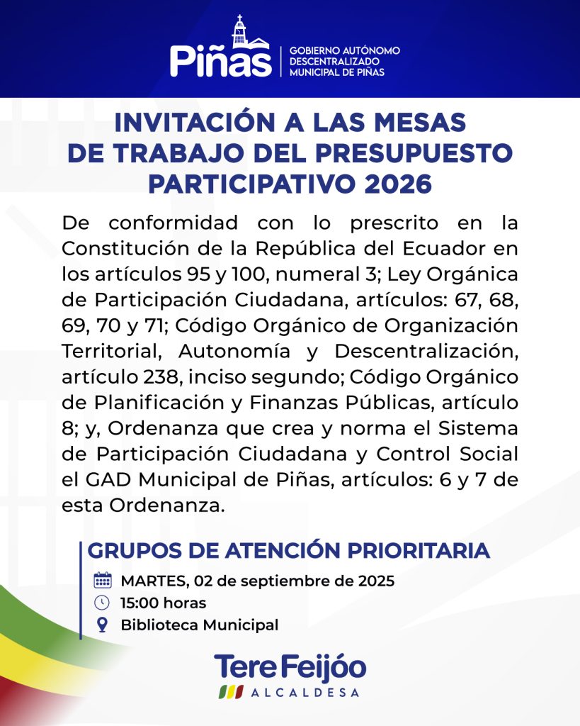 Invitación a las mesas de trabajo del Presupuesto Participativo 2026 NOTICIAS / agosto 29, 2025 Invitación a las mesas de trabajo del Presupuesto Participativo 2026 Leer más »